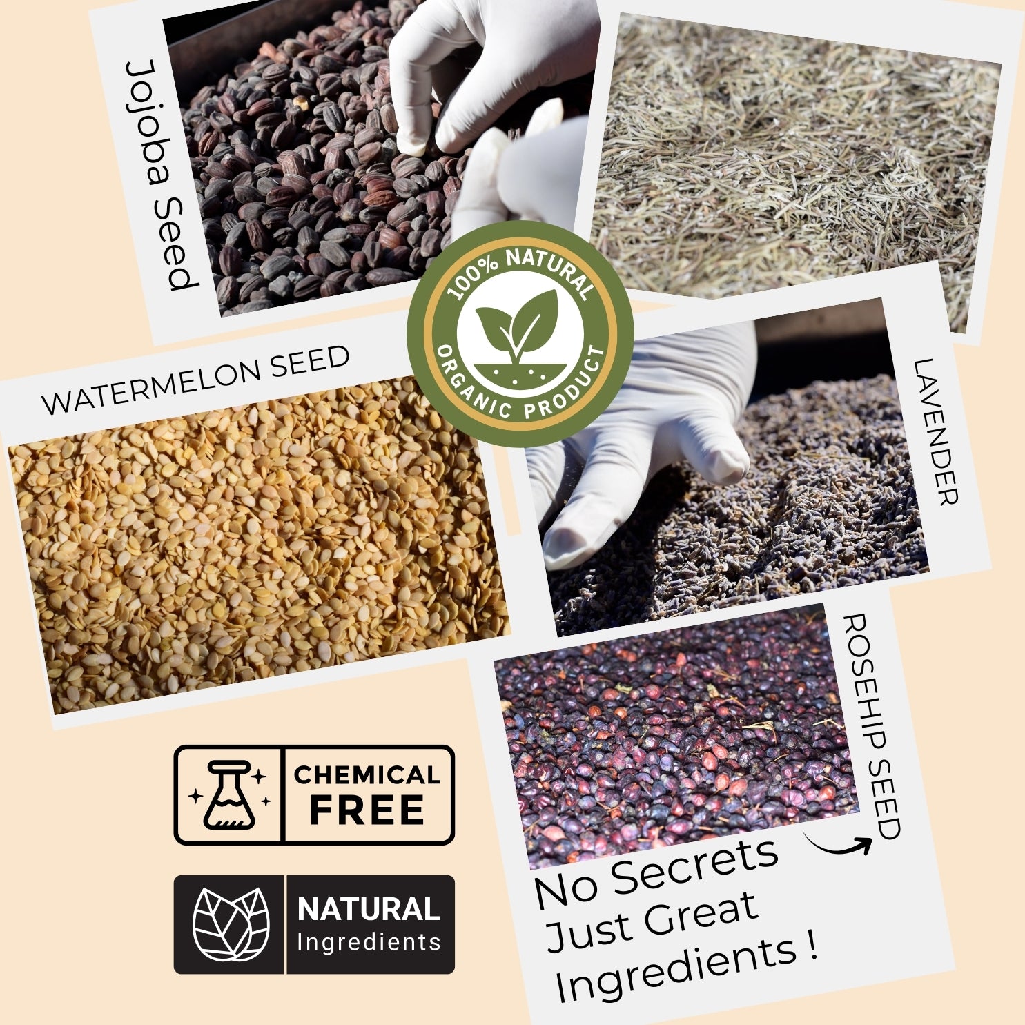 watermelon seed oil, jojoba oil infused with sal leaves, rosehip seed oil, blackcumin seed oil, bakuchi oil, rosemary essential oil, lavender essential oil, sweetlime essential oil.