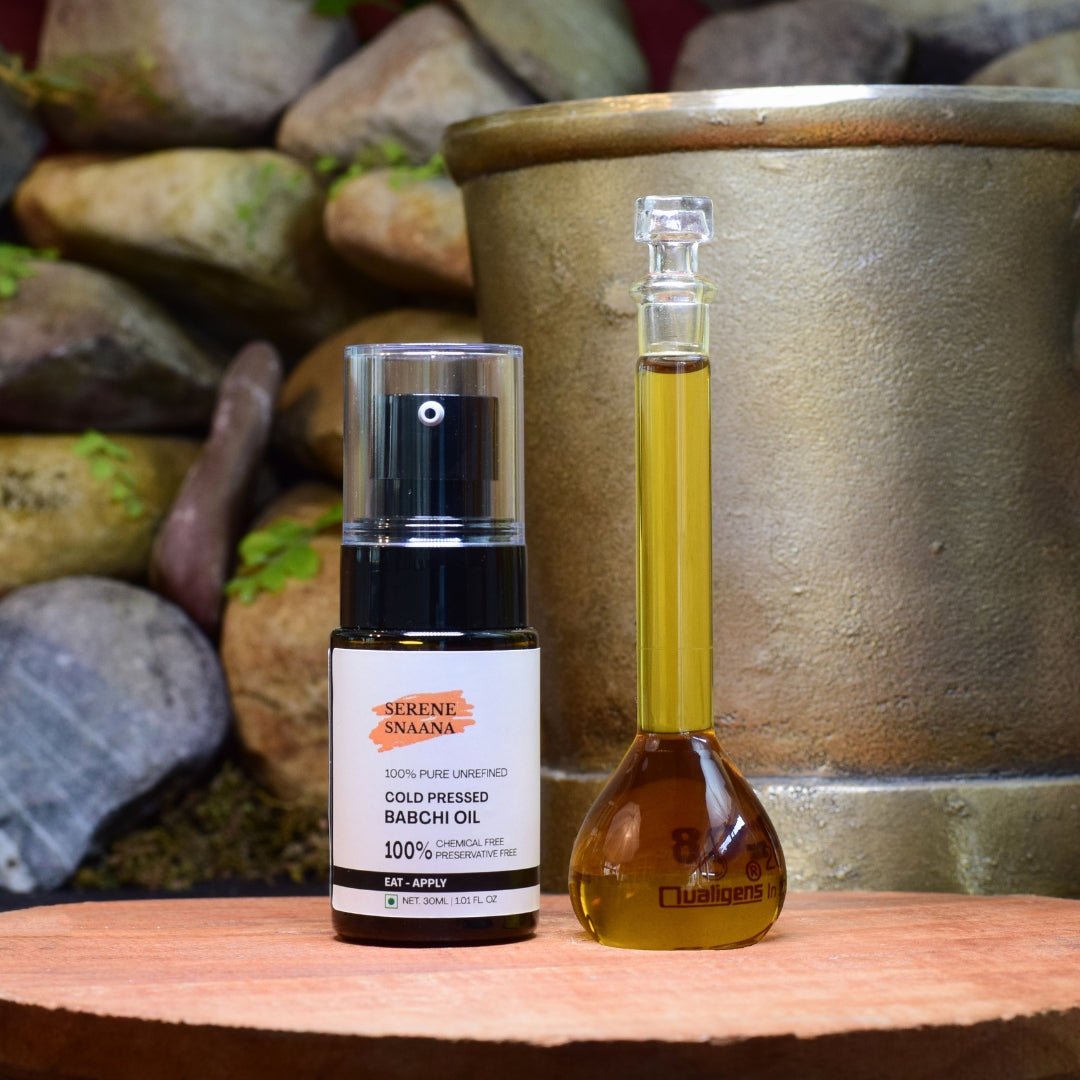 Babchi oil for Skin - Use in your 30s and beyond to keep your skin flawless. It works on Lines & wrinkles, Pigmentation, Elasticity & Firmness, Photodamage. Add a few drops to your face oil or body oil bottle to add benefits to your skincare regime.