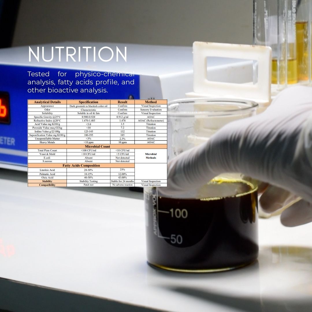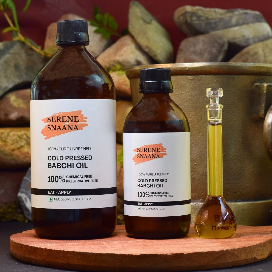 Cold pressed Babchi Seed Oil – nutrient-rich, raw & vegan. Ideal for skincare, hair care & overall health.