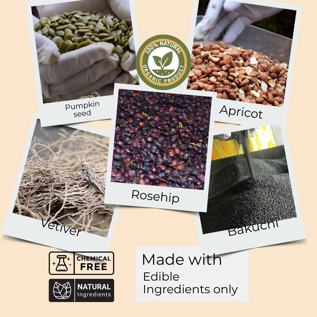 Apricot kernel oil, pumpkin seed oil, rosehip oil, bakuchi oil and essential oils of vetiver, grapefruit & turmeric.
