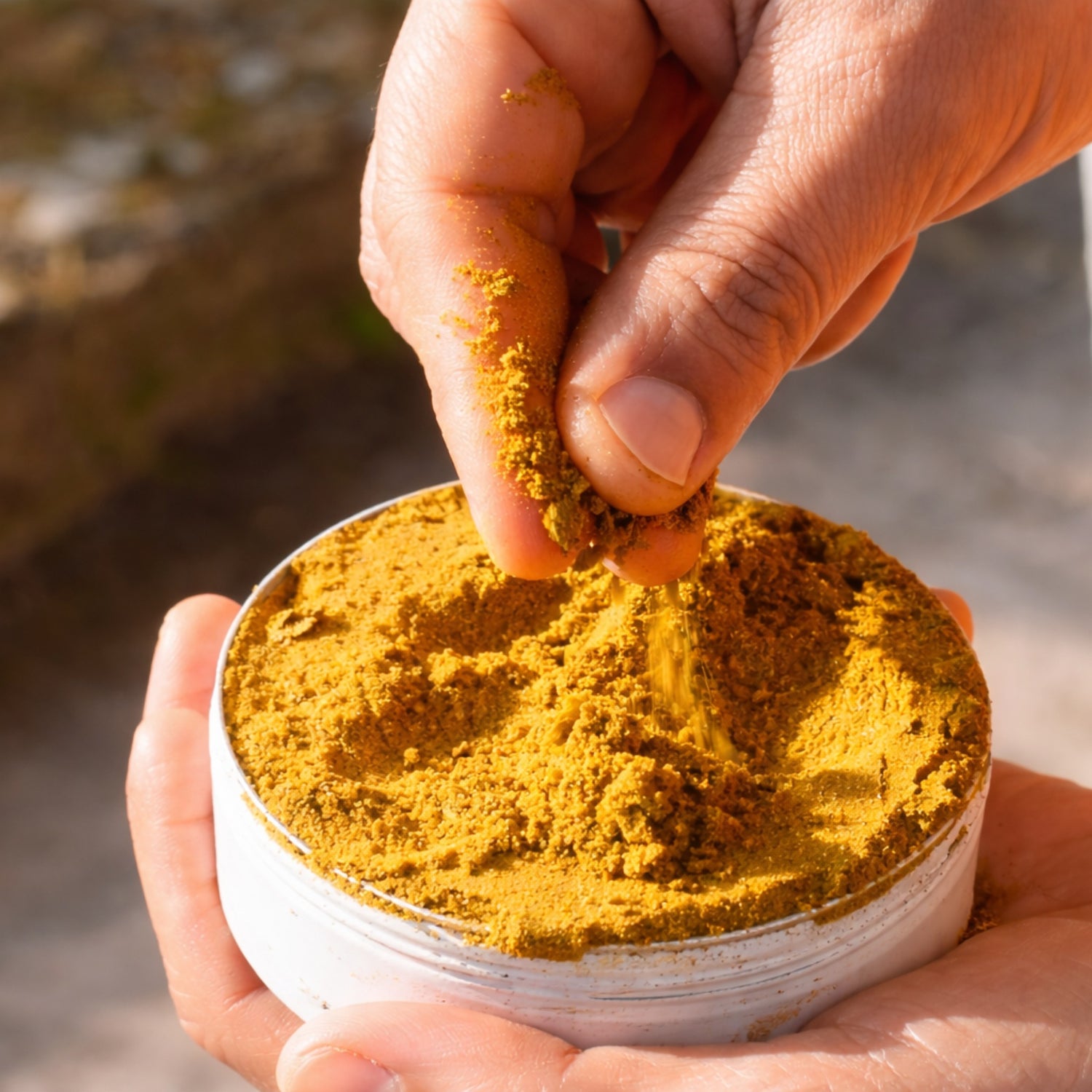The herbs in this formula — marigold, calendula, and chamomile — naturally contain plant pigments. Because they are kept in their pure, untreated form, the powder may leave a light yellow tint during application. This washes off easily with soap and water. At SERENE SNAANA, we do not chemically treat herbs to change their natural colour or aroma. Preserving botanicals in their pure form helps maintain their natural effectiveness. Storage Note :- Since the product is preservative-free, always take out the polisher with dry hands and close the jar tightly after use. This prevents moisture from entering the jar and helps keep the product fresh longer — similar to storing turmeric or cinnamon powder in the kitchen.