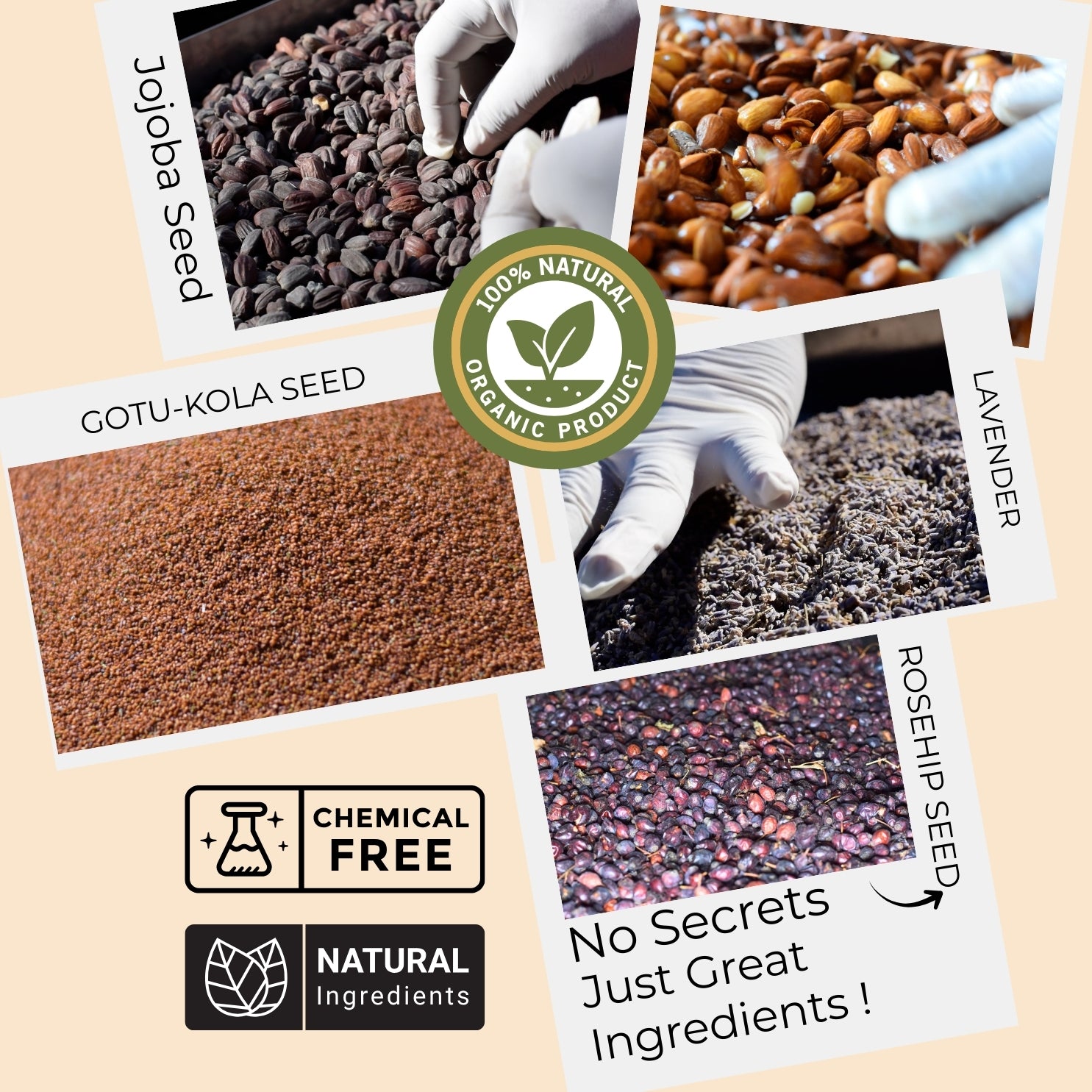 Gotu kola, perilla oil, jojoba oil, rosehip seed oil, almond oil, bakuchi oil, essential oils of lavender, fennel & juniper