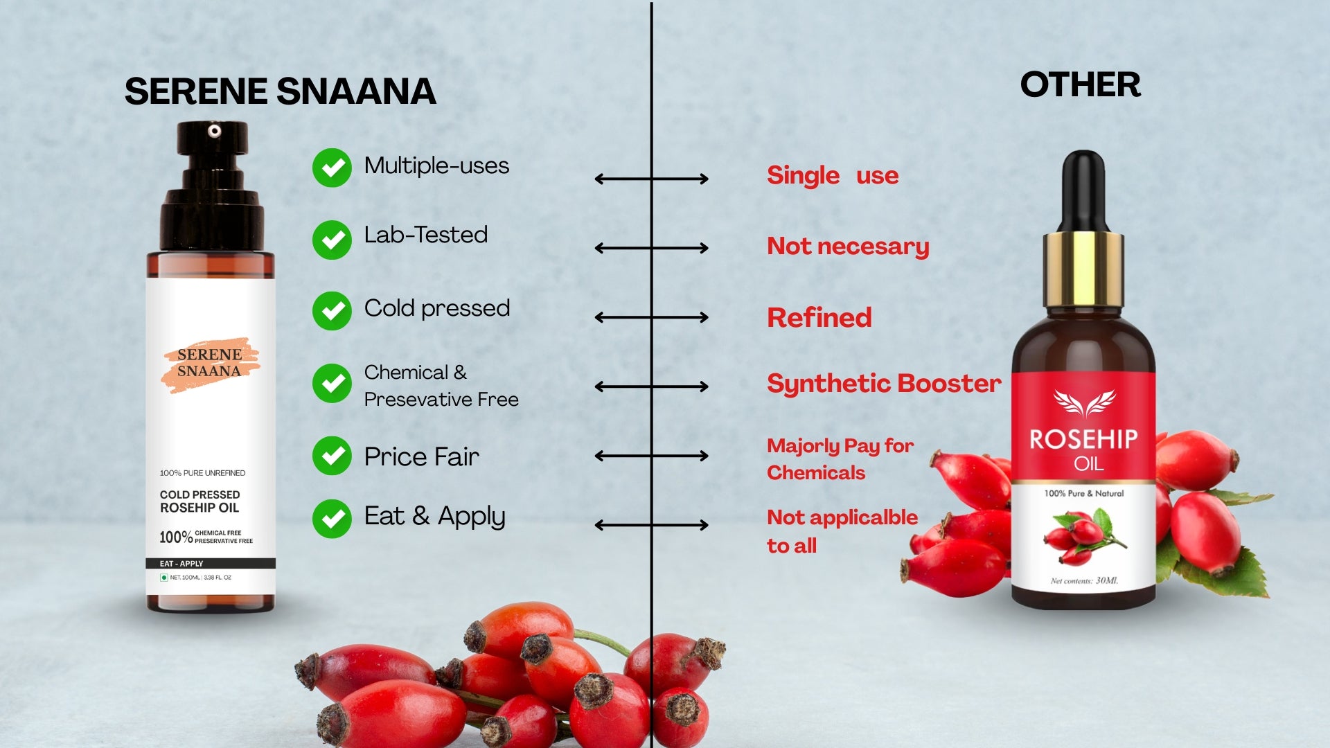 100% Pure Cold Pressed Rosehip Oil – raw, vegan & chemical-free. Rich in Vitamin C, light & non-greasy for face, body, scalp & hair nourishment.