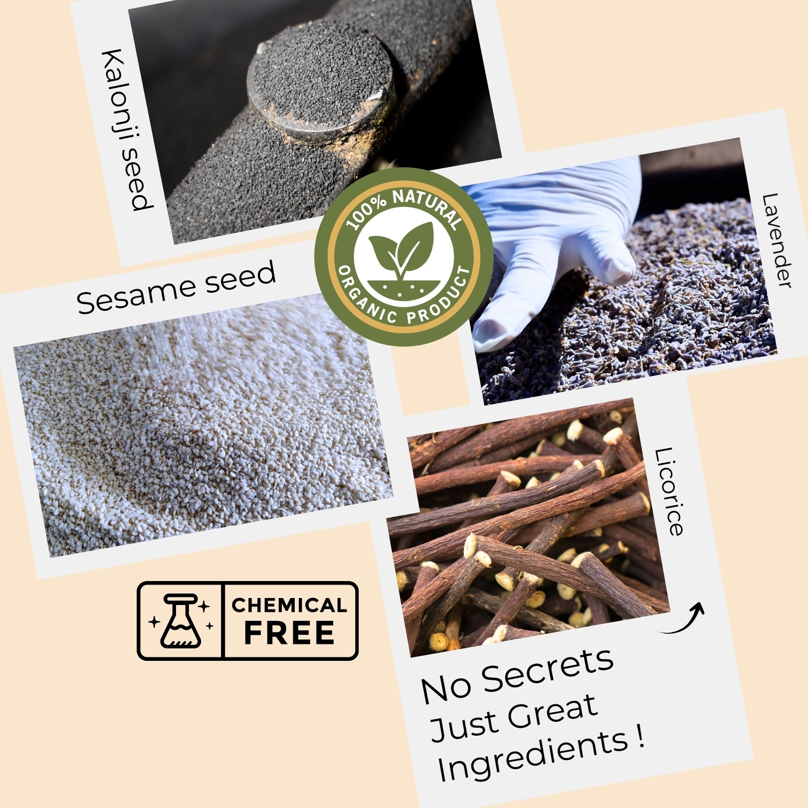 Sesame oil infused with ashwagandha, licorice, himalayan turmeric, chamomile, holy basil, olive oil, kalonji oil, castor oil and essential oils of orange, lavender, lime, geranium and vetiver