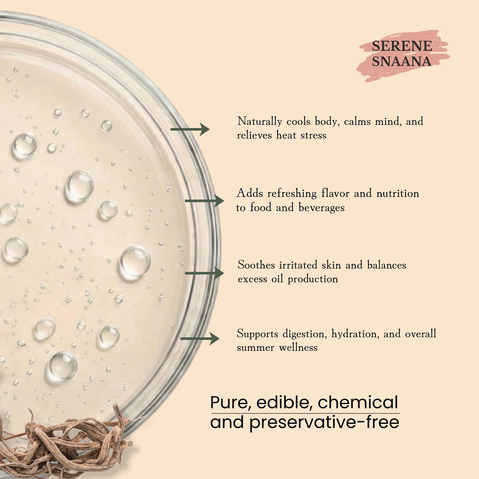 Food & Beverages - Add vetiver water to cooked food and beverages for flavor and nutrition.
